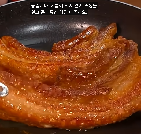 이제 가장 중요한 '크리스피' 과정입니다. 팬에 기름을 넉넉히 두르고 삶아진 삼겹살을 넣습니다. 이때 기름이 튈 수 있으니 반드시 뚜껑을 덮고 약불에서 천천히 구워주세요. 중간중간 뒤집어가며 겉면이 노릇노릇하고 바삭해질 때까지 익혀주면, 겉은 과자처럼 바삭하고 속은 육즙이 가득한 크리스피 삼겹살이 완성됩니다!