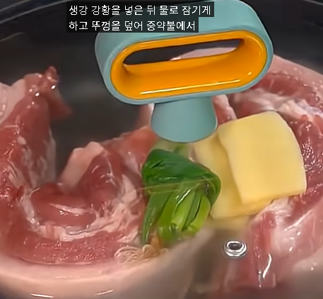 맥주에 재운 고기는 냄비에 넣고 소금 한 스푼, 대파, 생강, 그리고 건강과 풍미를 더해줄 강황 가루를 넣어줍니다. 고기가 잠길 정도로 물을 붓고 중약불에서 은근하게 끓여주는 것이 포인트입니다. 젓가락으로 고기를 찔렀을 때 부드럽게 쑥 들어간다면 속까지 아주 잘 익은 것입니다.